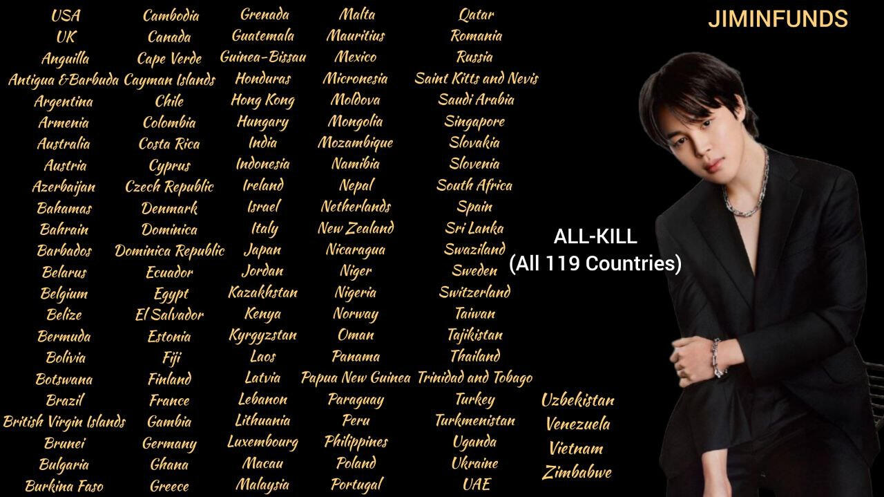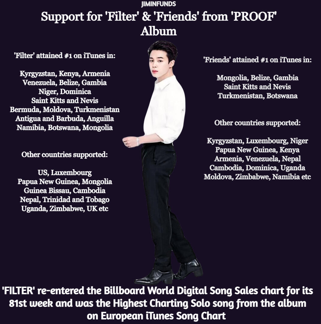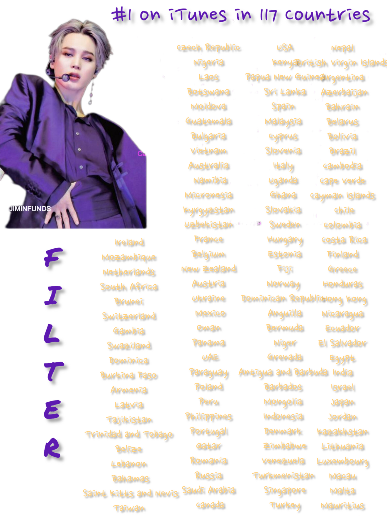 As detailed under 'solo songs under BTS', Jimin's Filter reached #1 on iTunes song charts in all the 119 available countries, the first ever BTS song to achieve this feat!