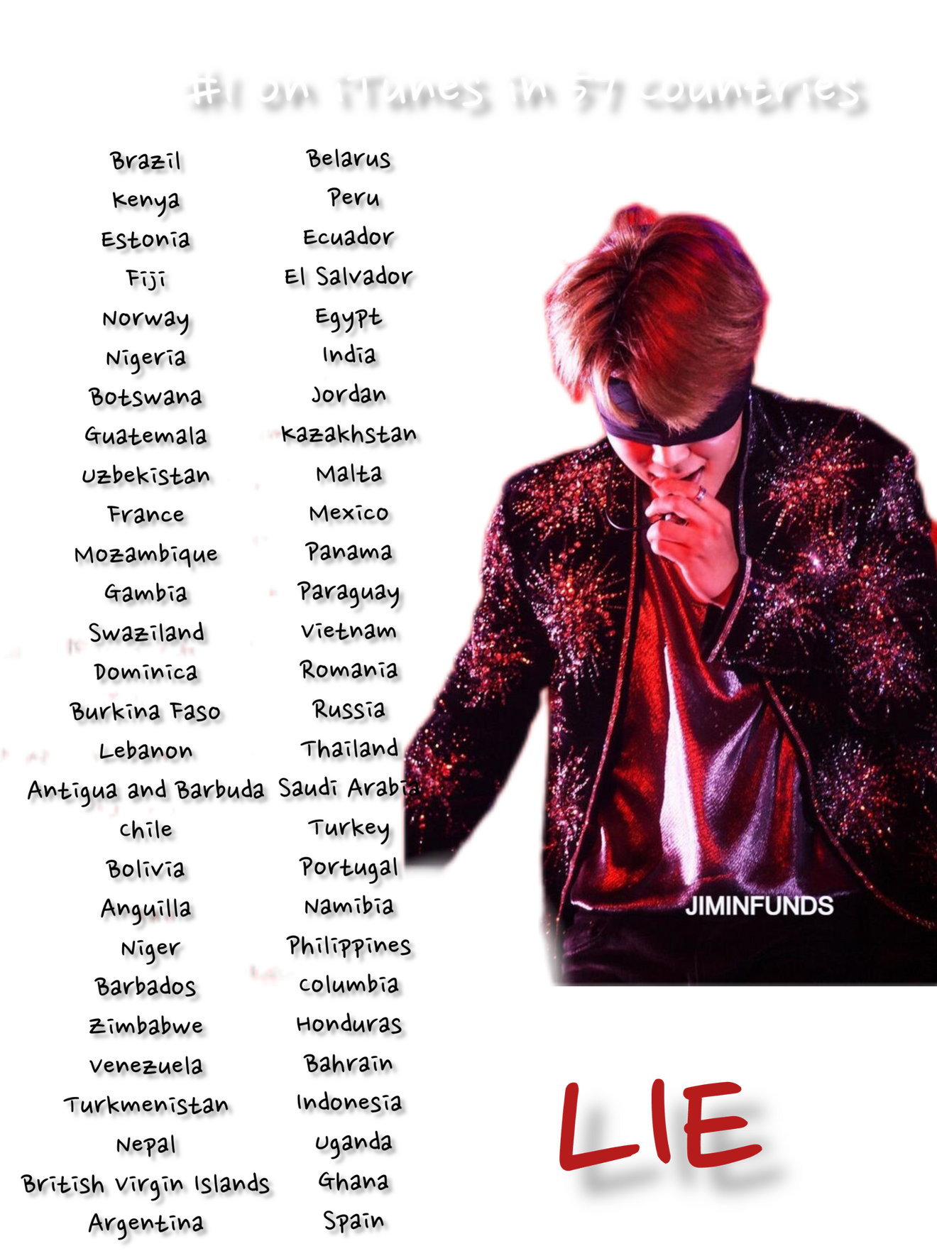 As detailed under 'solo songs under BTS', LIE reached #1 on iTunes song charts in 57 countries around the world, as shown..
