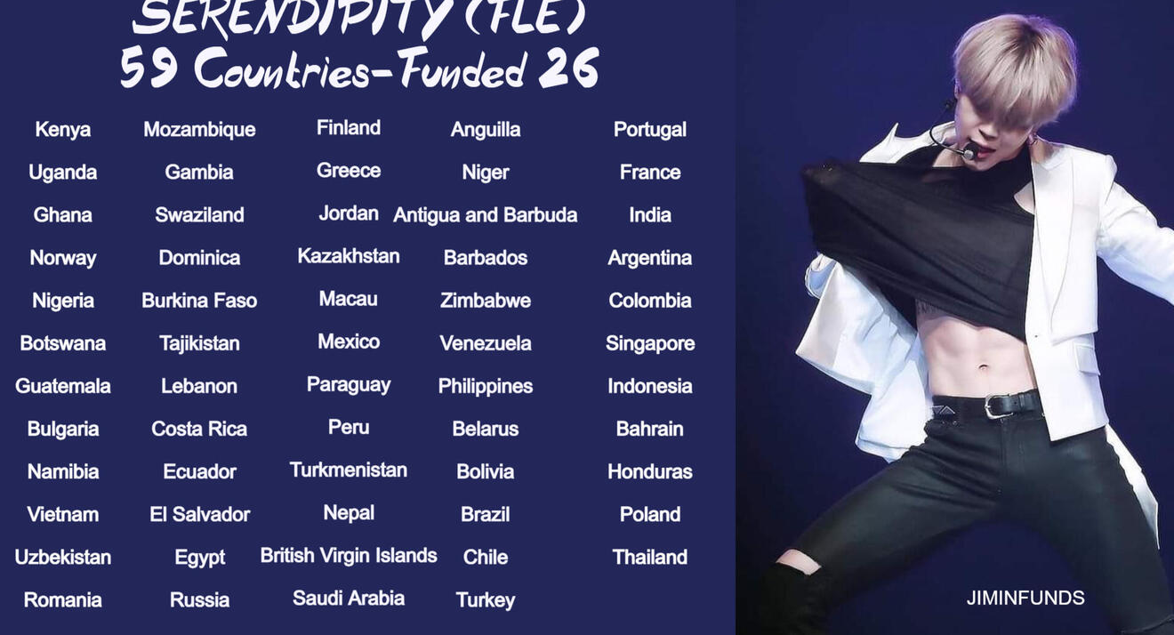 As detailed under 'solo songs under BTS', Intro: Serendipity reached #1 on iTunes song charts in 55 countries around the world, whereas Serendipity (Full Length Edition) attained #1 in 58 countries, as shown..